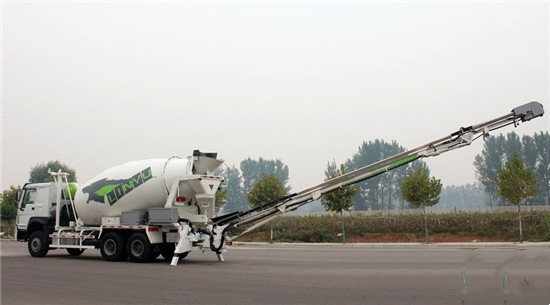 中集凌宇在該產(chǎn)品的研發(fā)過程中,與國外廠家聯(lián)合,借鑒國外技術(shù),并充分結(jié)合*國情,把國內(nèi)混凝土運(yùn)輸狀態(tài)以及施工情況進(jìn)行深入分析,對原有混凝土運(yùn)輸、施工產(chǎn)品進(jìn)行了創(chuàng)新性突破。這款皮帶輸送式自施工攪拌車的原理是將皮帶輸送設(shè)備與攪拌車結(jié)合,多段皮帶輸送裝置折疊或伸縮組合成輸送臂,將混凝土輸送至施工地。
